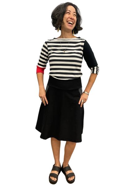 This organic cotton half sleeve boat neck tee is hand dyed and reversible! Wear the stripe to the front or the back, and note that the sleeves are different from each other!