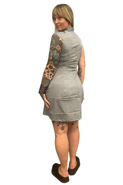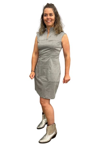 The Urban Mini Dress was in my very first collection, in 2001! We brought back this dress in a mystery fabric that was gifted to us. This wonderfully low maintenance, sleeveless mini dress has a slight a-line shape, and a mandarin collar.