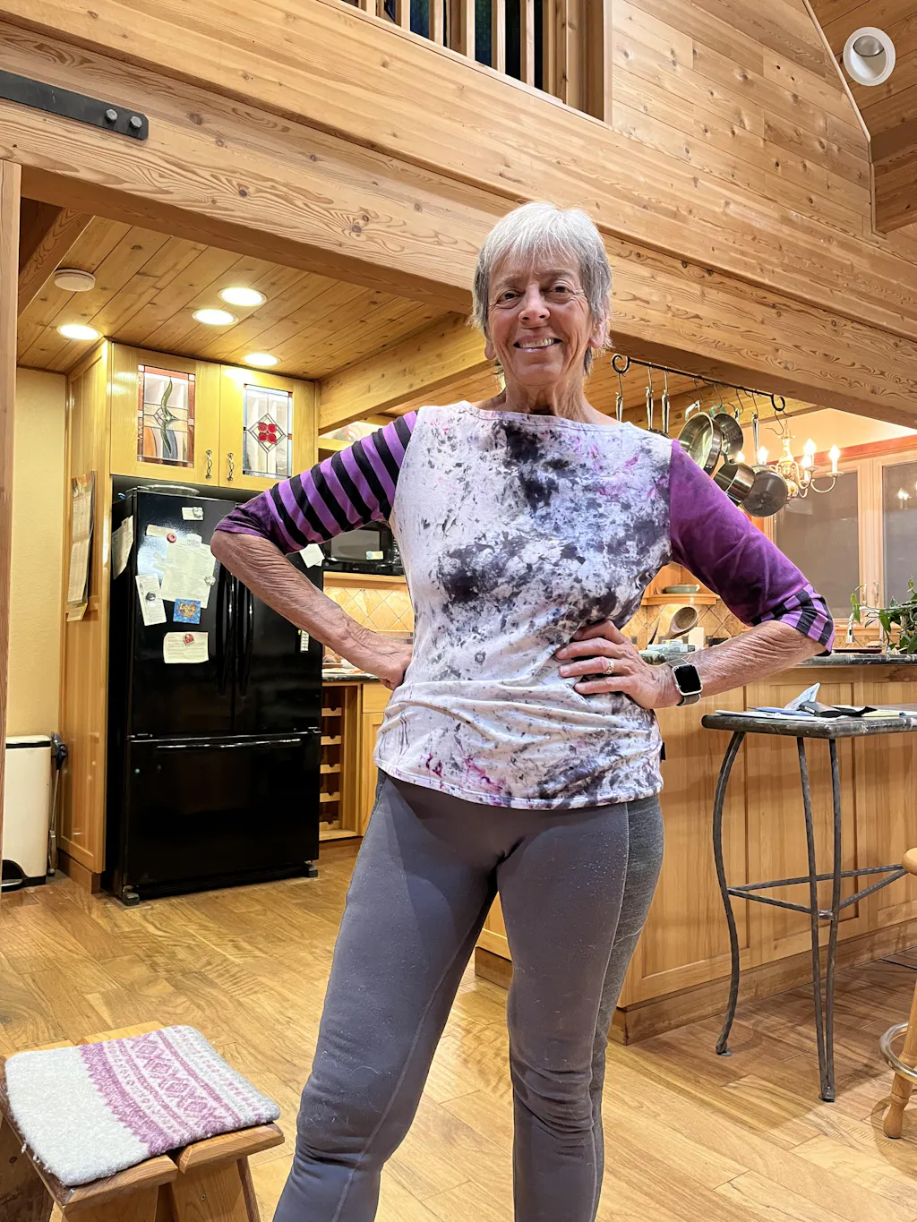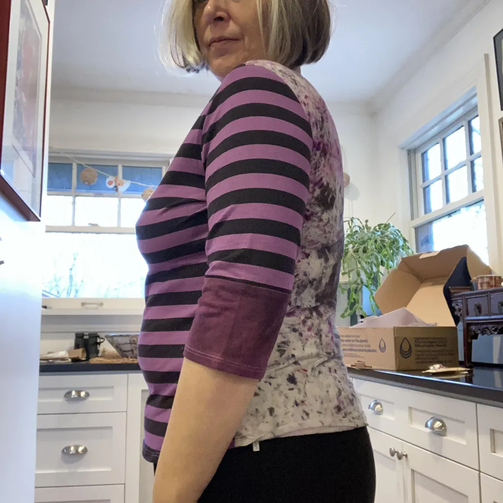 This organic cotton half sleeve boat neck tee is hand dyed and reversible! Wear the stripe to the front or the back, and note that the sleeves are different from each other!