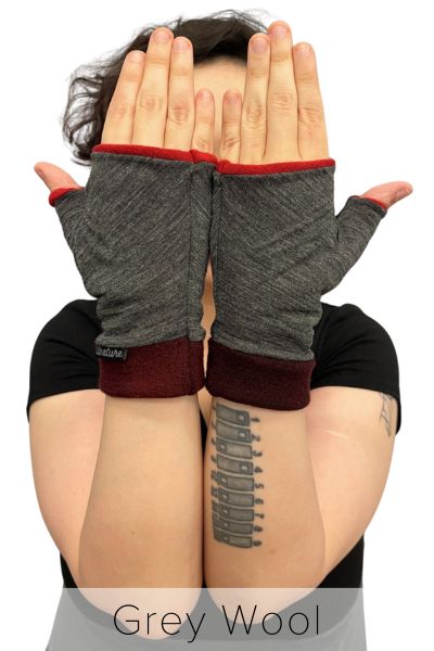 This listing is for our short black fingerless mittens! We make them from the scrap fabric leftover from cutting out other styles. The hemp fabric is so durable and the organic cotton (with a touch of spandex) makes them soft and stretchy. Knit Mitts® are the knockout knuckle-warming classic that keeps customers coming back again and again. Our fingerless mittens are the perfect transition piece for those long months that aren’t quite cold enough for you to surrender your mobility to the full suffocating restriction of gloves. These versatile, forearm-high wonder warmers will become your go-to solution for keeping cozy through a mild winter or just weathering a workday under the A/C vent. Because Knit Mitts® are made from upcycled scraps of the super soft extra stretchy sustainable fabrics you already love, we’re always rolling out new color combinations. When you run out of excuses to buy more for yourself, grab a pair to share! Texture’s trusty handy hand warmers are great for gift giving since everyone will already be asking where you got them anyway.
